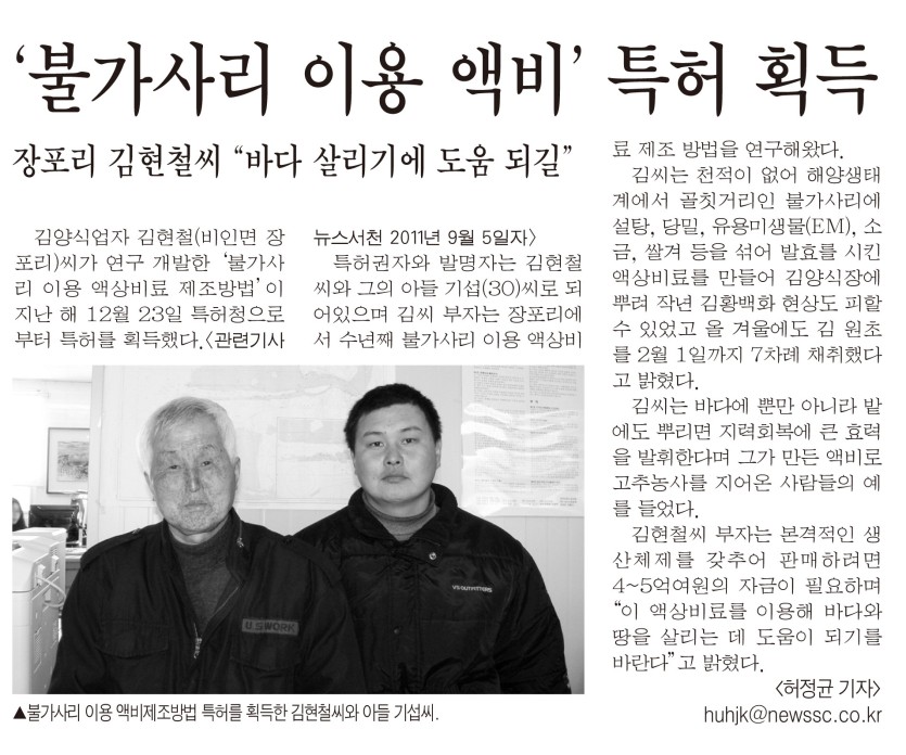 갤러리 카테고리 뉴스 [뉴스서천] 불가사리 이용 액비 특허 획득 등록일 2024-07-03 관리자 뉴스 바로가기 https://www.newssc.co.kr/news/articleView.html?idxno=22820 이전글 [매일경제] 이레바이오, 불가사리로 만든 친환경 비료 다음글 [서천신문] 사람, 사람들 인터뷰 목록